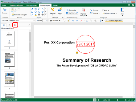 Wenn Sie einen digitalen Stempel einer anderen als der derzeit ausgewählten Seite auswählen, wechselt die Anzeige des Arbeitsfensters zu der Seite, auf der sich der digitale Stempel befindet.