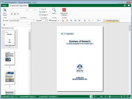 Wenn Sie ein Objekt im Arbeitsfenster auswählen, wird die Gesamtzahl der ausgewählten Objekte und die Anzahl der Textobjekte in der Statusleiste angezeigt.