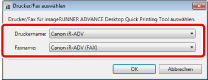 Die Dialogfelder [Drucker/Fax auswählen] und [imageRUNNER ADVANCE Desktop Quick Printing Tool-Einstellungen] werden angezeigt.