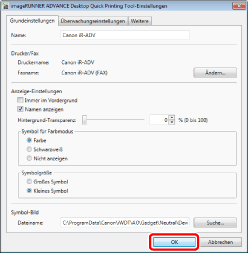 Ändern Sie die Einstellungen nach Bedarf im Dialogfeld [imageRUNNER ADVANCE Desktop Quick Printing Tool-Einstellungen] und klicken Sie auf [OK].