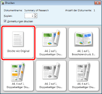 Möglicherweise wird das Dialogfeld [Drucken] der Anwendung, mit der das Dokument erstellt wurde, oder das Dialogfeld [Drucken] angezeigt. Wählen Sie in diesem Fall [Desktop Document Writer] als Ausgabedrucker und drucken Sie.