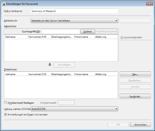 [Abbrechen]: Der Vorgang zum Versenden des Faxdokuments wird abgebrochen.