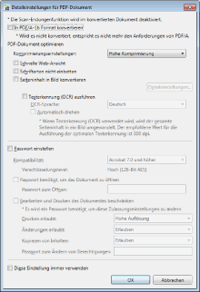 Wenn Sie aus Sicherheitsgründen den Zugriff auf das PDF-Dokument oder den Druck bzw. die Bearbeitung des Dokuments einschränken wollen, aktivieren Sie dieses Kontrollkästchen. (Kann nicht gewählt werden, wenn das Kontrollkästchen [In PDF/A-1b Format konvertieren] aktiviert ist.)