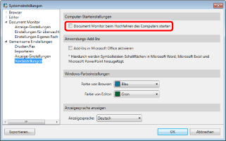 Menü [Datei] > [Optionen] > [Systemeinstellungen] > [Gemeinsame Einstellungen] > [Voreinstellungen] > [Document Monitor beim Hochfahren des Computers starten]
