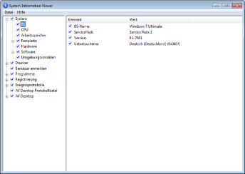In System Information Viewer werden die Umgebungsinformationen und Protokolldateien nur für Elemente gespeichert, deren Kontrollkästchen in der Strukturansicht und Informationsanzeige aktiviert sind.