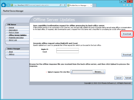 Wählen Sie die von Ihrem Canon-Händler ausgegebene Response-Datei in [Browse] aus und klicken Sie auf [Upload].