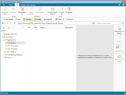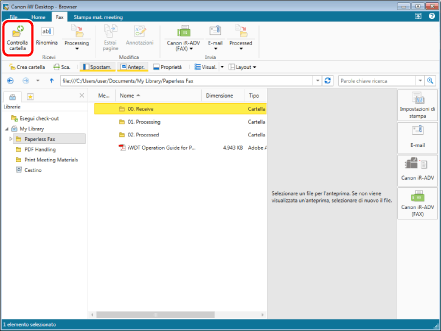 Selezionare la scheda [Fax] per commutare la visualizzazione della barra multifunzione. Selezionare la cartella "00. Receive" nella cartella "Paperless Fax".