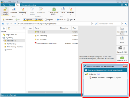 Quando un fax viene salvato nella cartella "00. Receive", sullo schermo del computer viene visualizzata la finestra [Elenco di documenti non letti/modificati].