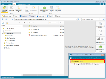 Facendo doppio clic sulla cartella "00. Receive" nella finestra [Elenco di documenti non letti/modificati], vengono visualizzati i contenuti della cartella. I documenti aggiunti vengono visualizzati in grassetto.