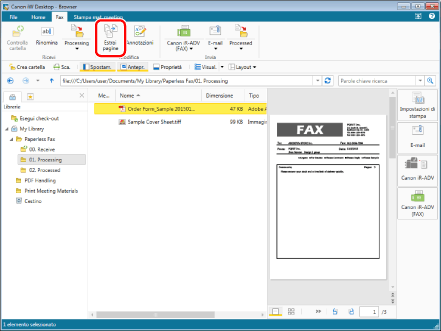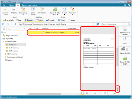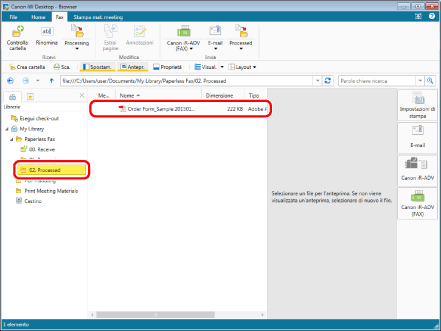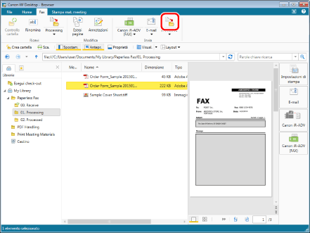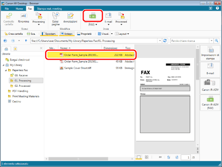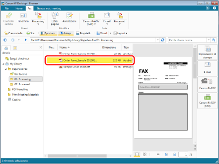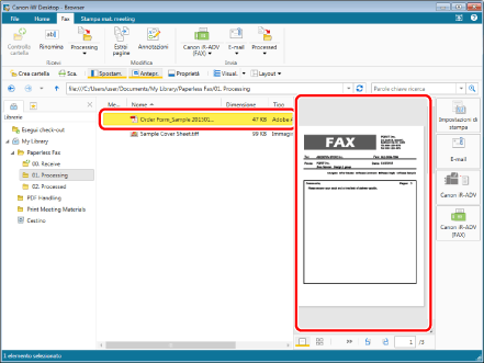 Selezionare il fax inviato nella cartella "01. Processing" (in questo esempio, "Order Form_Sample 20150101125534.pdf").