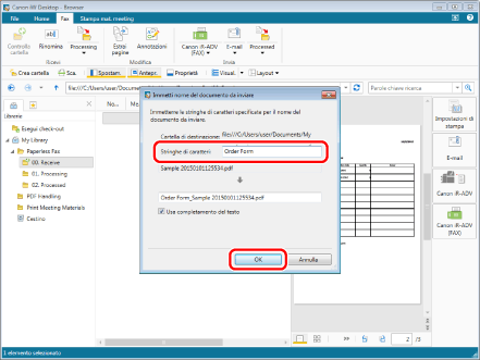 Nella finestra di dialogo visualizzata, il testo immesso in [Stringhe di caratteri] viene aggiunto al nome del documento. In questo esempio, immettere "Order Form" e fare clic su [OK].