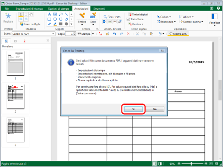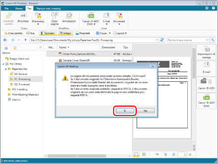 Fare clic su [Sì]. La pagina estratta viene salvata ("Order Form_Sample 20150101125534_1.pdf" in questo esempio).
