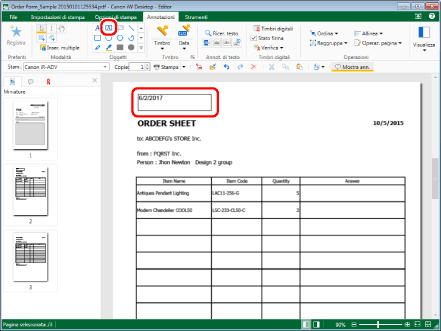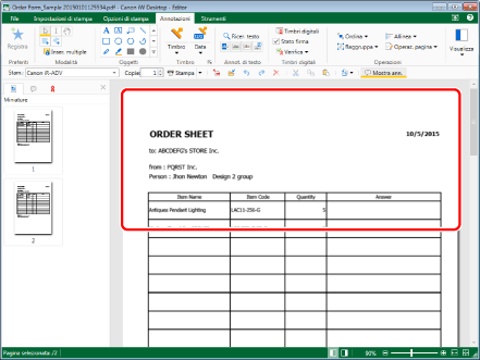 Selezionare "Order Form_Sample 20150101125534.pdf" e fare clic su [Annotazioni] nella scheda [Fax]. Desktop Editor viene avviato in una schermata separata.