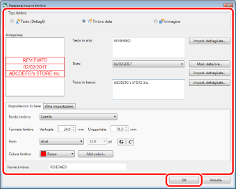 Utilizzando la schermata illustrata di seguito come riferimento, immettere i contenuti del timbro. Al termine, fare clic su [OK] e fare clic su [Chiudi] nella finestra di dialogo [Gestisci timbri].