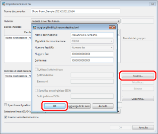Nella finestra di dialogo visualizzata, fare clic su [Nuovo]. Nella finestra di dialogo visualizzata a seguire, immettere le informazioni del destinatario e fare clic su [OK].