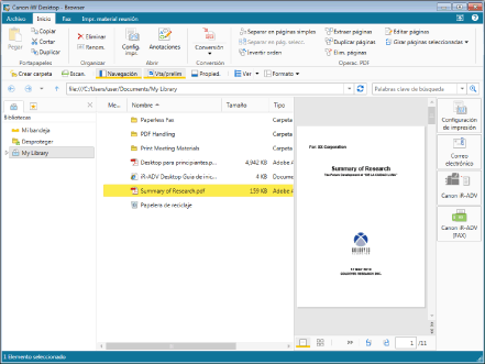 Los documentos de bibliotecas pueden imprimirse, enviarse por fax, enviarse por correo electrónico y editarse utilizando la pantalla del Desktop Browser. Como las carpetas de una biblioteca y dispositivos externos tales como imageRUNNER ADVANCE pueden monitorizarse, el estado de documentos que han sido añadidos o actualizados y el estado de dispositivos externos pueden comprobarse en la pantalla Desktop Browser.