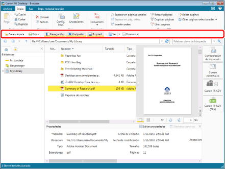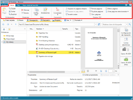 La cinta incluye pestañas con comandos para realizar operaciones y editar los documentos almacenados en las bibliotecas y con comandos para enviar y recibir faxes y materiales de impresión.
