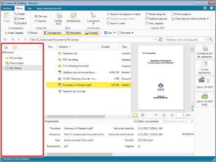 Pestaña [Bibliotecas]: muestra una vista de árbol de bibliotecas, carpetas de protección y carpetas de Mi bandeja.