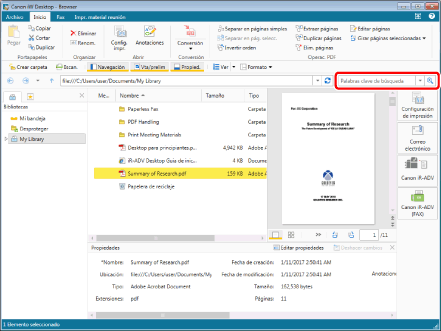 La pantalla Desktop Browser consta de un "menú [Archivo]", "cinta", "ventanas" y "barras". Se pueden realizar búsquedas en documentos y carpetas en una Pantalla de búsqueda separada.