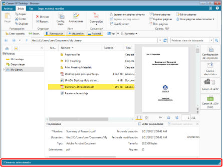 La barra de estado muestra el número de archivos seleccionados en la Ventana de visualización de la lista de archivos. Si no hay archivos seleccionados, la barra de estado muestra el número total de carpetas y archivos mostrados en la Ventana de visualización de la lista de archivos.