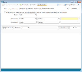 La Pantalla de búsqueda también contiene los elementos para configurar las condiciones de las búsquedas detalladas, realizar una búsqueda y guardar las condiciones de búsqueda.