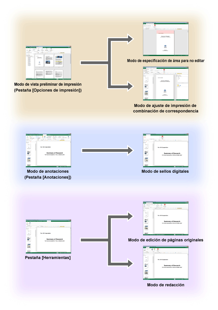 Además del Modo de impresión y el Modo de anotaciones, Desktop Editor tiene otros cinco modos que ofrecen funciones muy cómodas.
