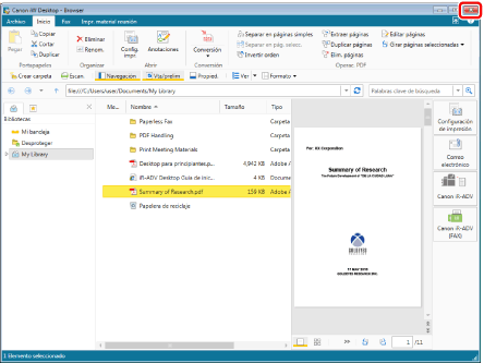 Desktop Browser se abre con la misma ventana que cuando se cerró por última vez. Sin embargo, cuando vuelva a abrir Desktop Browser, la Ventana de navegación se inicia mostrando la pestaña [Bibliotecas] aunque antes del reinicio mostrase la pestaña [Condiciones de búsqueda].