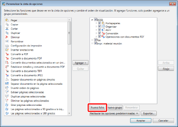 Si hace clic en [Nueva ficha] después de seleccionar una pestaña de la lista de la derecha, [Nueva ficha(Personalizado)] se añade debajo de la pestaña seleccionada.