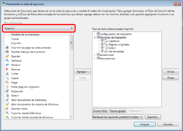 Para cambiar el orden de visualización de las pestañas, seleccione la pestaña de la que quiera cambiar el orden de visualización en la lista de la derecha y haga clic en [Arriba]/[Abajo].