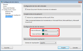 [Configuración del sistema] > [Configuración común] > [Preferencias] > [Configuración de color de ventana]