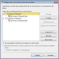 Aparecerá el cuadro de diálogo [Configuración del orden de varios documentos] cuando se selecciona la casilla de verificación [Mostar cuadro de diálogo para la configuración del orden de documentos al importar varios documentos] en [Configuración del sistema].