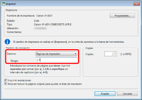 El orden de entrada de [Rango] no es el orden de impresión. Tanto si escribe "1,2" como "2,1", las páginas se imprimen en el orden "1,2".