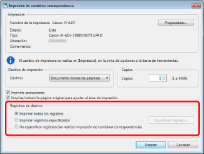 Cuando imprima un documento con campos de Combinación de correspondencia establecidos, [Impr.] cambiará automáticamente a [Imp. comb/corr.]. Para ejecutar la impresión de Combinación de correspondencia, realice una de las siguientes operaciones.