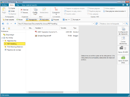 Por ejemplo, utilizando un archivo ya creado, puede crear material nuevo. En este caso, habría que editar el archivo existente. Utilizando la pestaña [Inicio] registrada al instalar Desktop, puede preparar eficazmente estos materiales. La pestaña [Inicio] se establece por defecto con funciones especializas para convertir documentos, y para usar documentos PDF.
