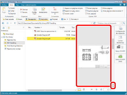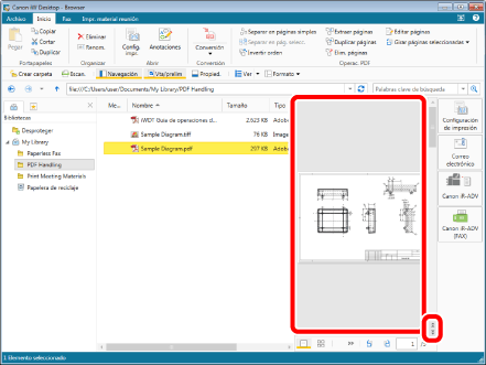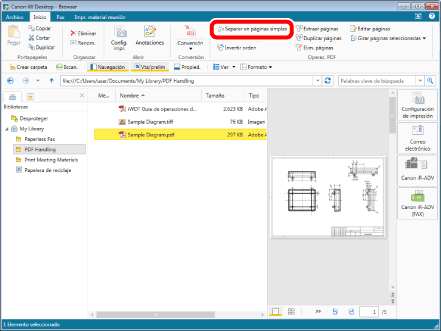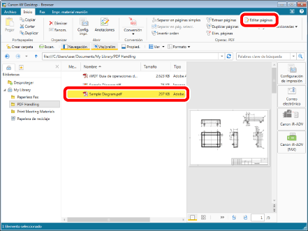 Seleccione el archivo "Sample Diagram.pdf" que creó en "Convertir en un documento PDF" y, a continuación, haga clic en [Editar páginas] en la pestaña [Inicio]. Se iniciará el Modo de edición de páginas.