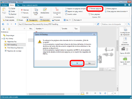Haga clic en [Extraer páginas] en la pestaña [Inicio] y, a continuación, haga clic en [Si] en el cuadro de diálogo que aparece. La página extraída se guarda en la misma ubicación.