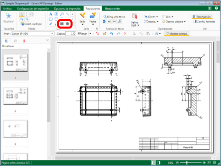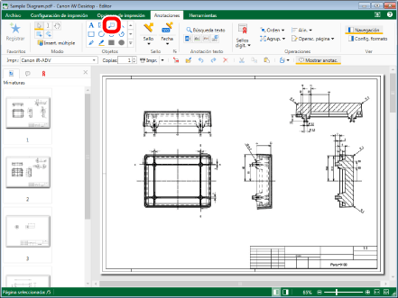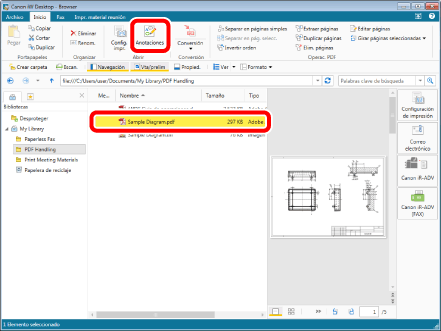 Seleccione el archivo "Sample Diagram.pdf" que creó en "Convertir en un documento PDF" y, a continuación, haga clic en [Anotaciones] en la pestaña [Inicio].