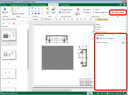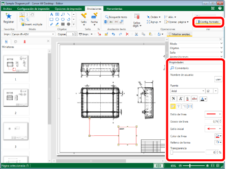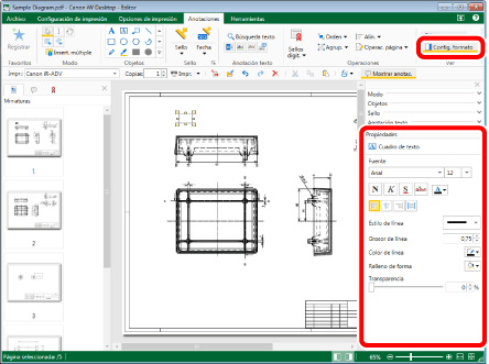 Haga clic en el grupo [Ver] > [Config. formato] en la pestaña [Anotaciones] y configure las propiedades de la anotación.