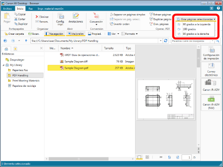 Haga clic en [Girar páginas seleccionadas] en la pestaña [Inicio] y seleccione [90 grados a la izquierda], [180 grados] o [90 grados a la derecha].
