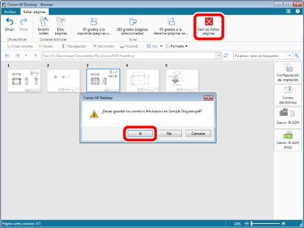 Haga clic en [Salir de Editar páginas] en la pestaña [Editar páginas] y, a continuación, haga clic en [Sí] en el cuadro de diálogo que se muestra. El documento se guardará.