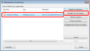 Seleccione la Biblioteca de red en [Lista de bibliotecas registradas] y luego haga clic en [Cambiar info. de registr].