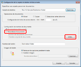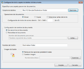 Si cambiar de nombre un botón en el cuadro de diálogo [Configuración de la carpeta de destino del documento], el nombre del botón de la Carpeta de destino del documento que aparece en la cinta y la barra de herramientas también cambia automáticamente.