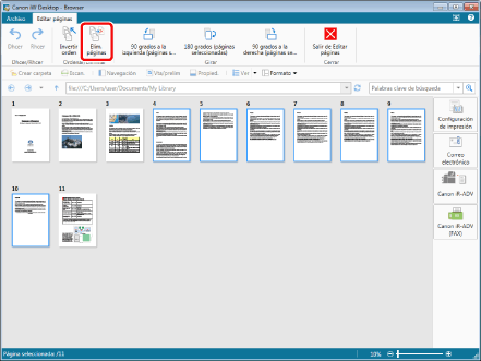 En la vista de miniaturas, puede seleccionar múltiples páginas haciendo clic en ellas mientras mantiene pulsada la tecla [Mayús] o la tecla [Ctrl] del teclado.