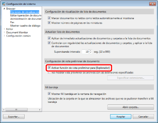 La función de vista preliminar de Desktop Browser y la función de vista preliminar de Windows Explorer son iguales. La configuración de Desktop Browser para activar la vista preliminar de los documentos de Office no está relacionada con el ajuste [Mostrar controladores de vista previa en el panel de vista previa] en las opciones de carpeta de Windows Explorer. La activación de la vista preliminar se realiza por separado por cada tipo de archivo y, aunque no es común, es posible que algunos tipos de archivos no puedan verse. En este caso, confirme si puede ver el tipo de archivo en Windows Explorer.