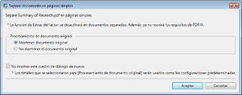 De ahora en adelante, el cuadro de diálogo [Separar documento en páginas simples] no volverá a aparecer. El modo de procesamiento seleccionado en [Procesamiento de documento original] se aplicará en el documento original.