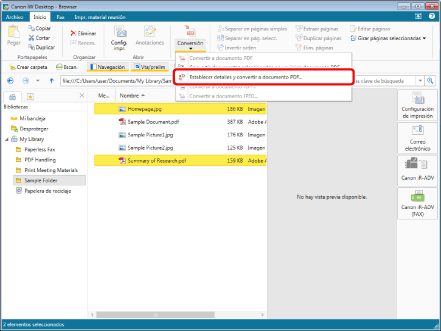 (Conversión) en la cinta y seleccione [Establecer detalles y convertir a documento PDF].