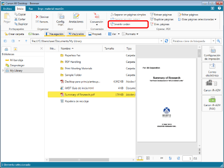 Seleccione el documento PDF para el que se vaya a invertir el orden de página en la Ventana de visualización de la lista de archivos.