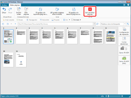 Se muestra la pestaña [Editar páginas] en la cinta y empieza el Modo de edición de páginas.