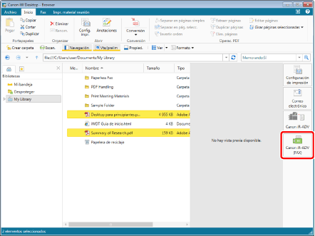 Para enviar por fax un documento desde la barra de salida de la pantalla Desktop Browser, hay que registrar un botón de salida de fax en la barra de salida. Además, para enviar por fax varios documentos como un único documento, debe seleccionar [Combinar documentos seleccionados en un documento con Editor para enviar un fax] en los ajustes del botón de salida de fax. Para obtener más información sobre el registro y establecimiento de botones, consulte: