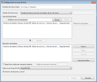 Si utiliza el cuadro de diálogo de propiedades de fax de Windows para cambiar el nombre de un fax cuando este ya se ha registrado en un botón de salida de fax, no podrá enviar por fax ese documento utilizando el botón de salida de fax.